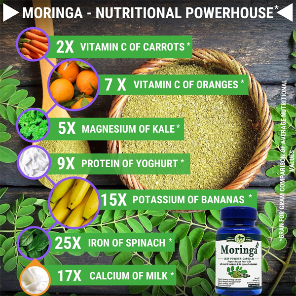 - Nutrient-Rich: Moringa leaves are a rich source of vitamins and minerals, including vitamin C, vitamin A, calcium, potassium, and iron.